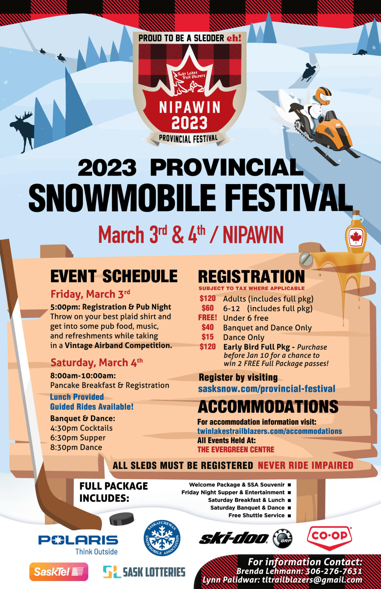 The Provincial Snowmobile Festival is back, March 3rd-4th in Nipawin! Everything kicks off Friday March 3rd with registration and a vintage pub night and air band competition. Saturday starts with a pancake breakfast followed by a day of riding, with optional guided rides available! Following a full day of riding everyone will meet back at the Evergreen Centre for the banquet and dance.