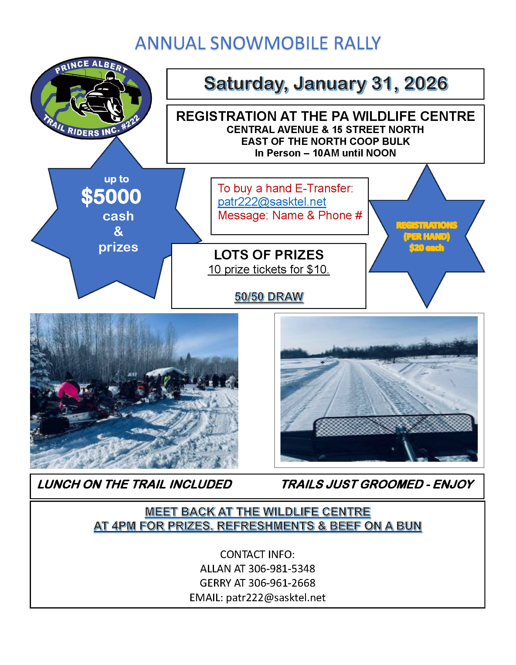 Saturday, January 31st, 2026 Registration at the PA wildlife centre Central Avenue & 15 street north (east of the north coop bulk) In Person Registration - 10AM - 12PM Lunch on the trail included Meet back at the wildlife center at 4PM for prizes, refreshments and beef on a bun Lots of Prizes!! 10 Prize tickets for $10 50/50 Draw up to $500 cash and prizes  $20 registration per hand To buy a hand E-Transfer: patr222@sasktel.net Message: Name & Phone # CONTACT INFO: ALLAN AT 306-981-5348 GERRY AT 306-961-2668 EMAIL: patr222@sasktel.net
