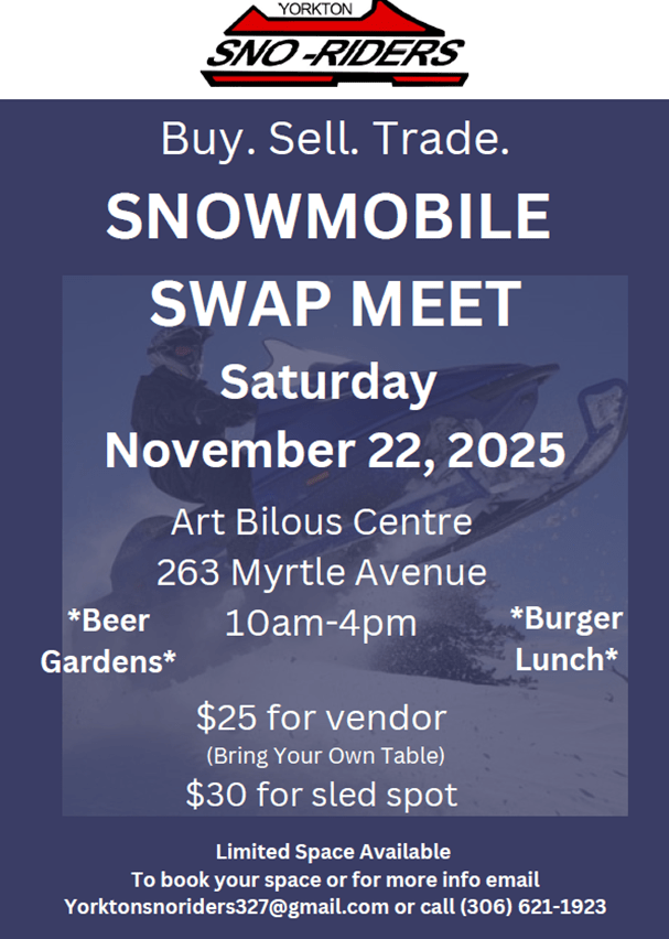 Saturday November 22, 2025 Snowmobile Swap Meet!! $25.00 for vendor (bring your own table) $30.00 for sled spot Limited Space Available To book your space or for more info email Yorktonsnoriders327@gmail.com or call (306) 621-1923Additional Info